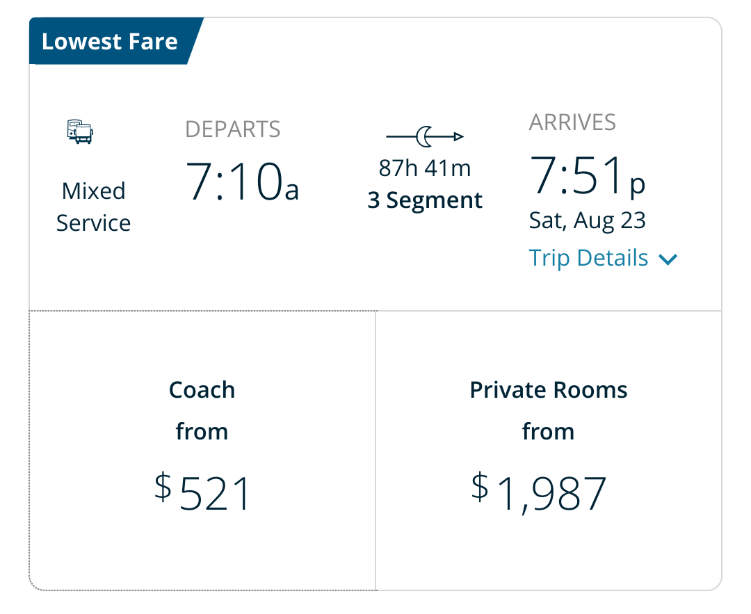 @charlotte $521 for an 87 hour trip, wednesday (there are no trains on tuesdays) to saturday, some of it bus, and thats just one way