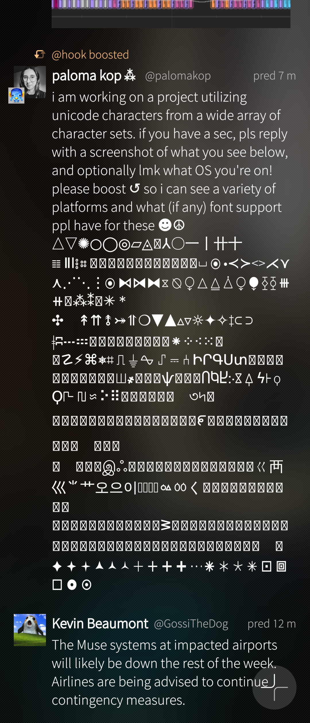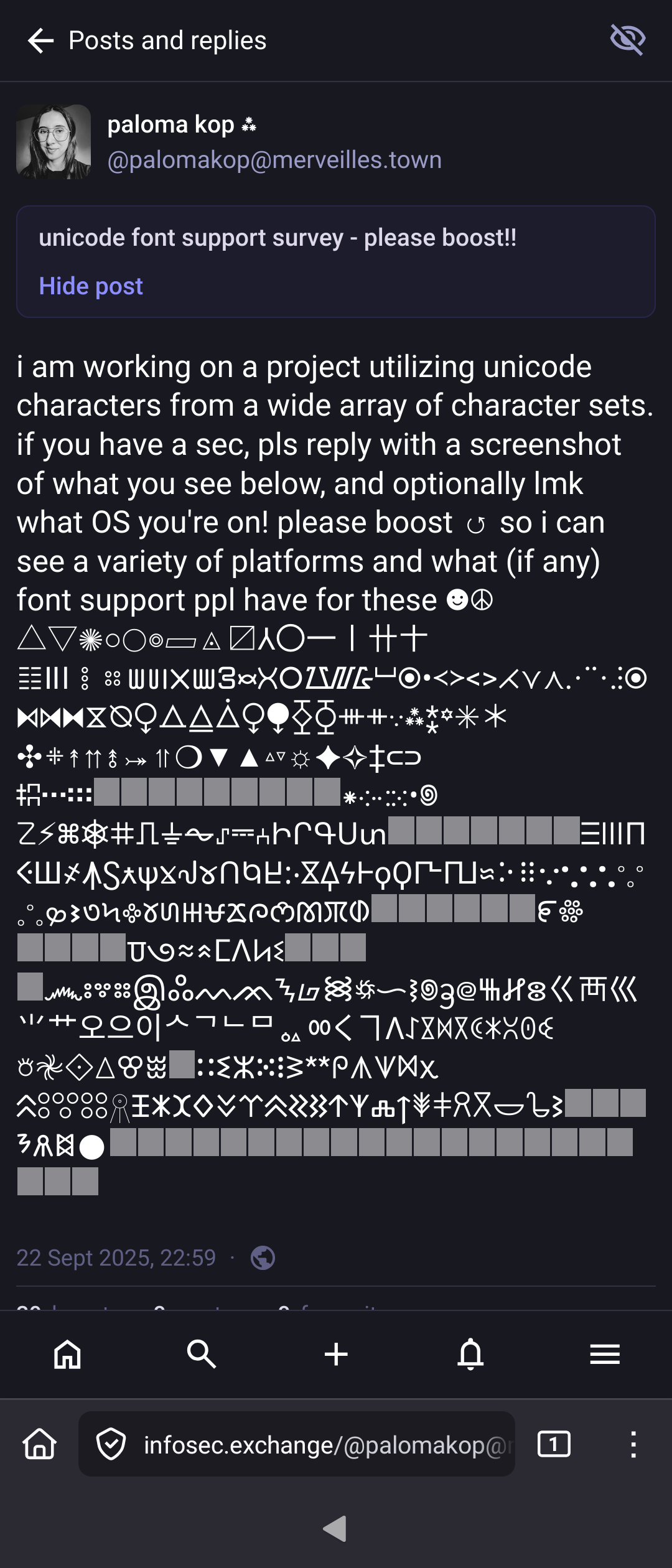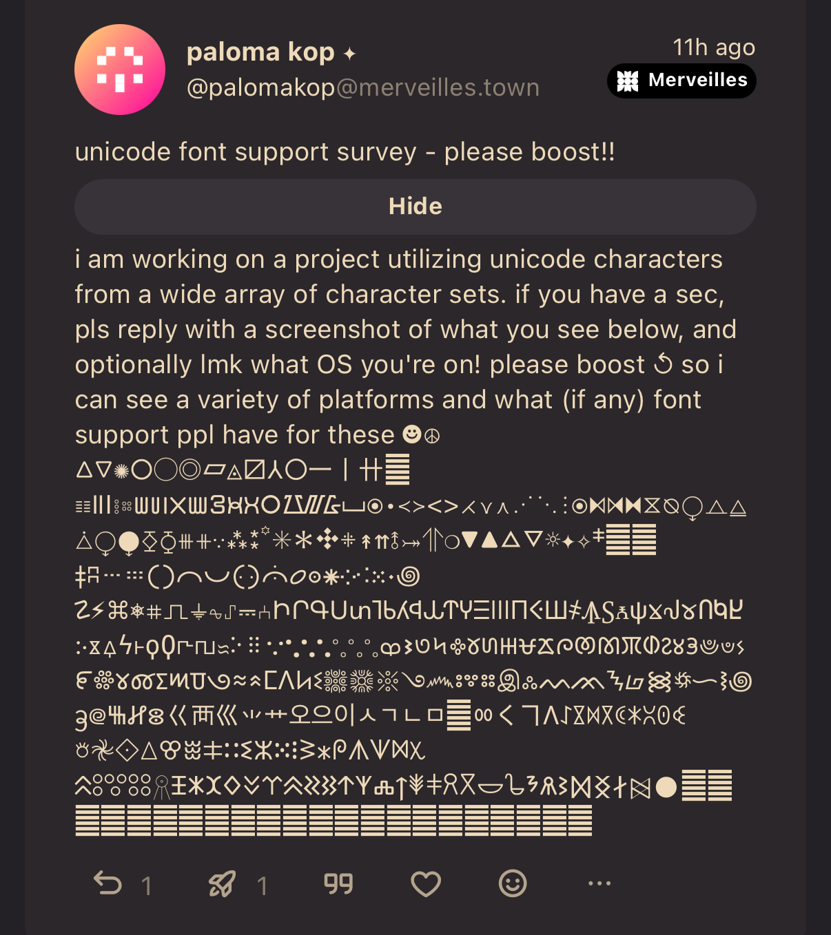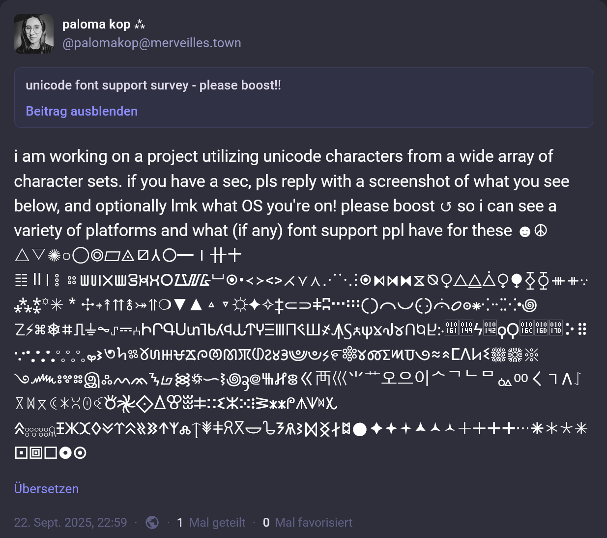 i am working on a project utilizing unicode characters from a wide array of character sets. if you have a sec, pls reply with a screenshot of what you see below, and optionally lmk what OS you're on! please boost ↺ so i can see a variety of platforms and what (if any) font support ppl have for these ☻☮︎