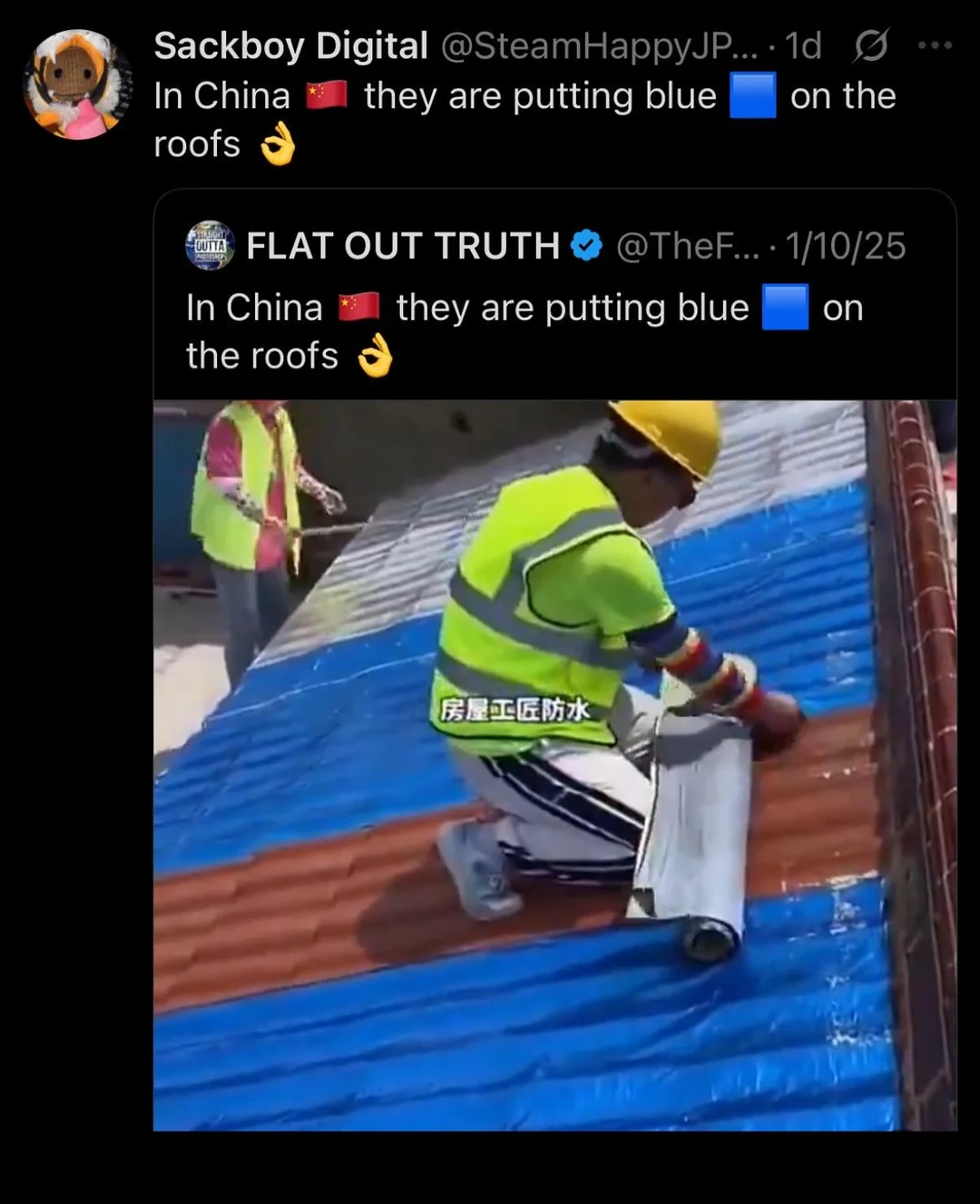In China 🇨🇳 they are putting blue 🟦 on the roofs 👌