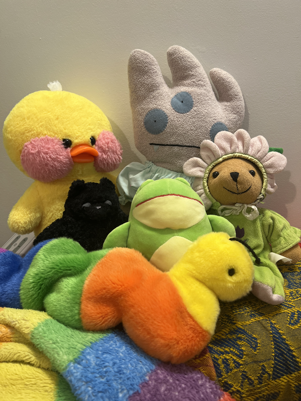 @charlotte here are a couple of plushies that I consider transgender…starting from the top left: Punchy The Duck (non binary trans masc style influencer) Tray Uglydoll (alien girl thing that lives in your sink drain and eats your scraps) Doug Jellycat (tired trans guy with a beer gut and a 9-5) Josh The Frog (jolly old trans man who owns an arcade) Beanie Baby (beanie baby) Inchy The Inchworm (a beautiful girl with simple needs…)