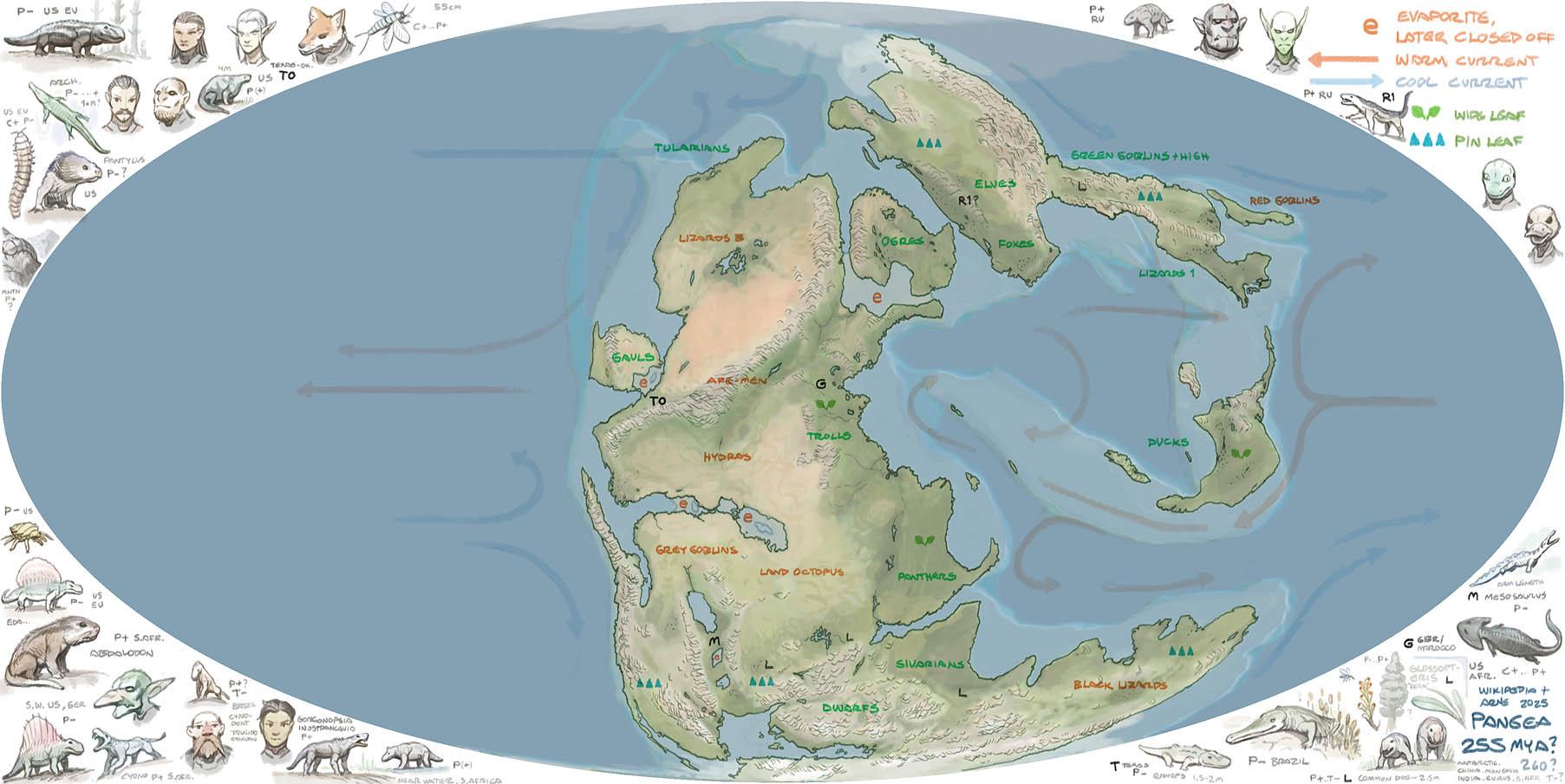 Permian Pangea map continued. Found out there's a mineral called evaporite, which sounds like it's from Flash Gordon, but it's actually something that forms when lake or sea evaporates in sealed off bays and such (due to tectonic movement and heating). So when I plotted it out it kind of matched some habitats of Permian creatures that went extinct... due to habitat loss then, I assume.