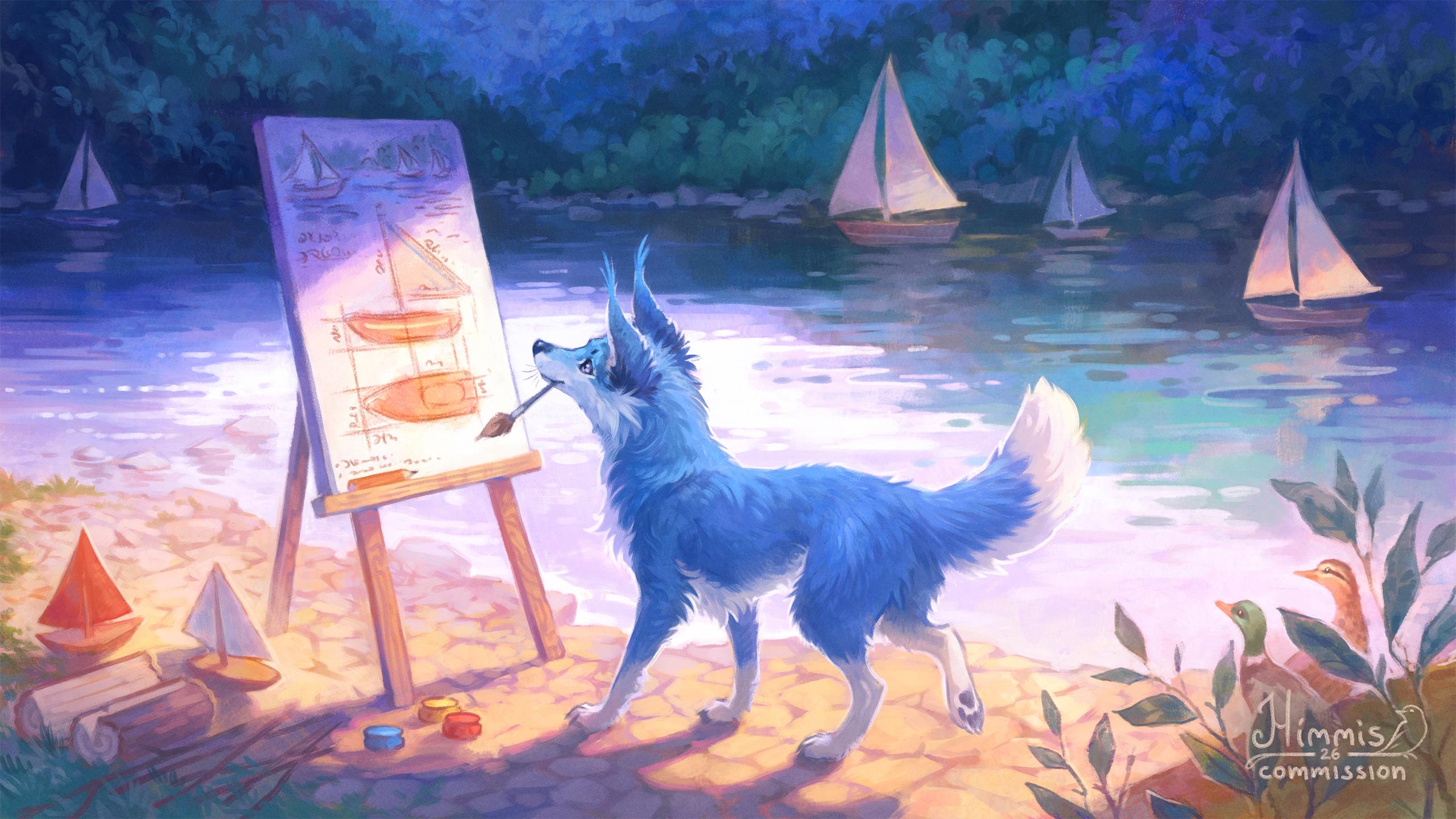 "Ready for Certification" - Drawing for Folleach, featuring their wolf inventing a brand new way of not getting drenched while swimming - Boats!